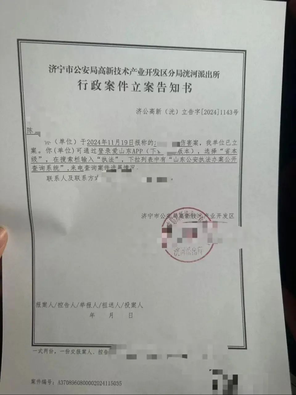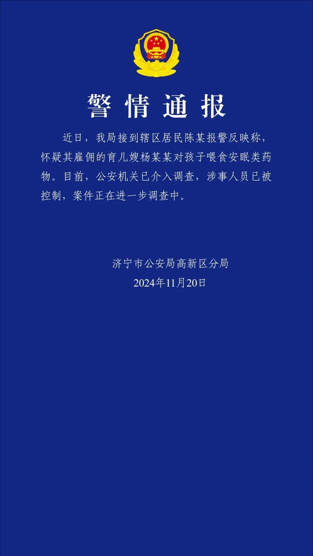 11月20日,山东济宁市公安局高新远隔局通报: