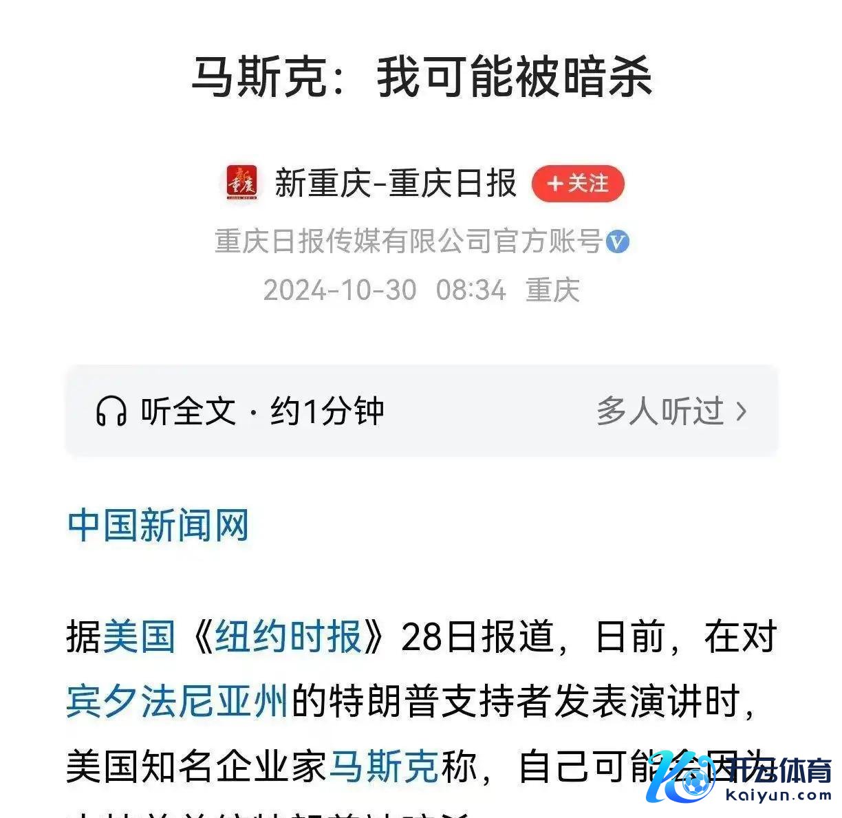 近日,好意思国富豪马斯克又一次登上了天下舞台,不外这一趟倒不是因为火箭和汽车,而是因为他将“遗嘱”给提前发出去了。一个50多岁的体格健康的亿万财主,怎样会忽然作念出这样的决定呢?还说什么最灾祸的情况?再斟酌到他近期的一举一动,不少东谈主齐初始估计,马斯克此举,究竟是为了好意思国的出路开云体育,照旧为了他我方的人命。
