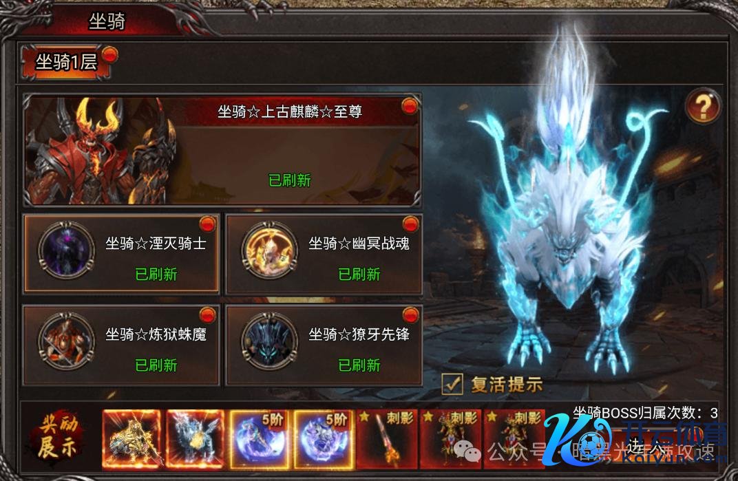 坐骑BOSS可从【跨服战场-主管战场】干涉,击杀即有契机解锁珍稀坐骑变幻,更可产出坐骑公约、骑战装备!坐骑BOSS为个东谈主包摄,玩家每天有3次包摄次数,每天0点刷新;今日未用完的次数,次日可重复,最多重复至9次;击杀坐骑BOSS有几率掉落超强坐骑、坐骑装备!
