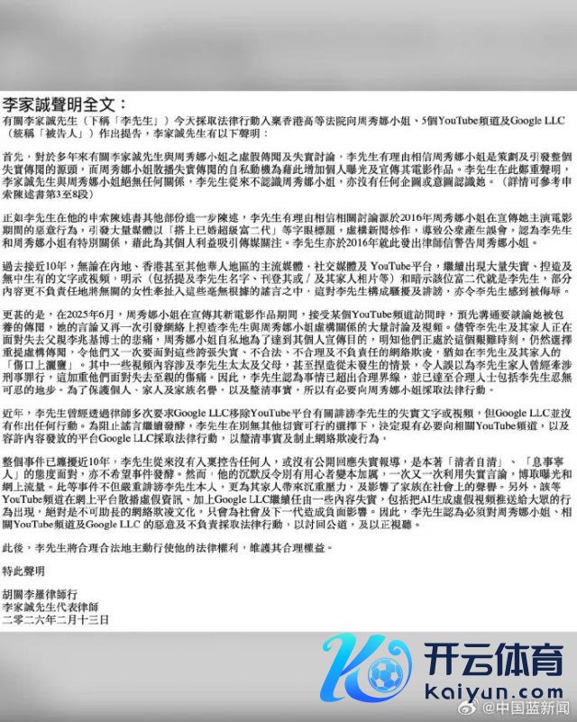2 月 13 日下昼,《香港商报》官方微博账号发文称,恒基兆业地产集团主席李家诚于 2 月 13 日入禀香港高级法院,向艺东谈主周秀娜及多个自媒体账号等作出提告。