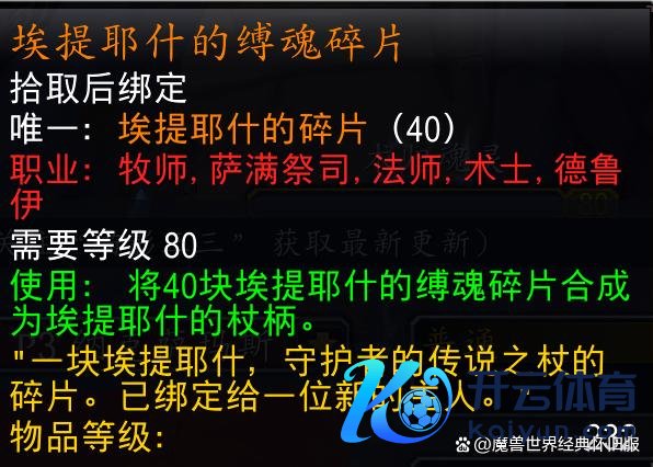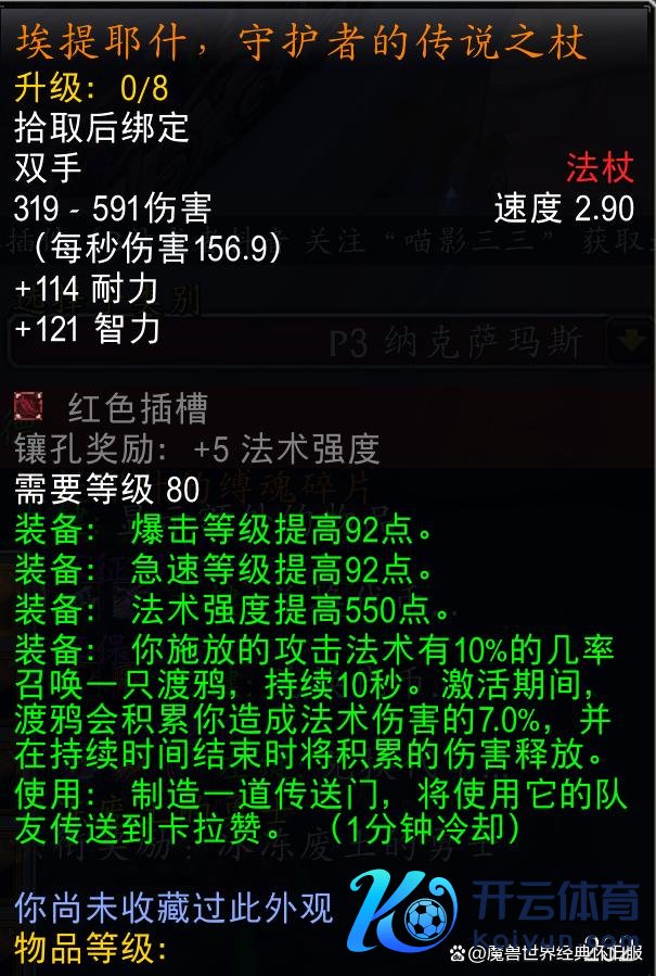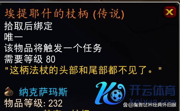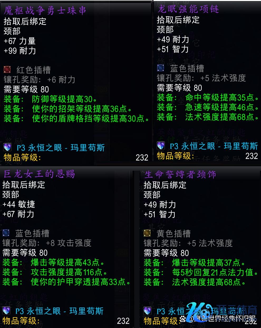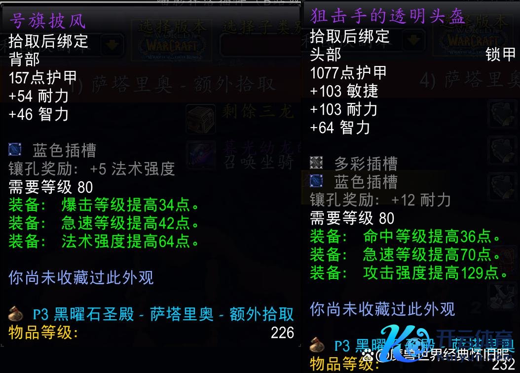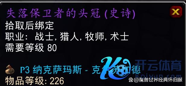 时光服数据库中不朽之眼掉落装备226和232等第的齐有,诺甘农的印章这种小佳构饰品就很缺憾没能升级到232等第。与原版巫妖王之怒不异,不朽之眼仍然需要纳克萨玛斯萨菲隆掉落的钥匙激活BOSS,任务奖励四条232等第带珠宝插槽的项链,对许多行状专精来说不比橙色项链差。