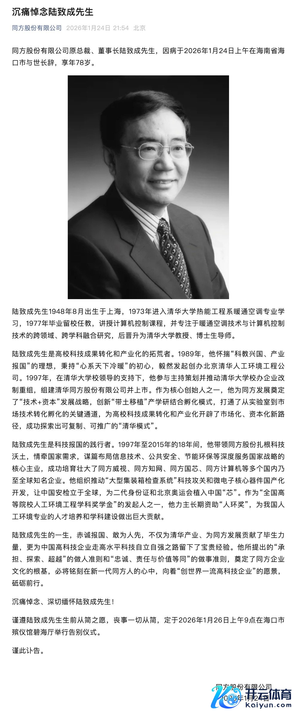 每经AI快讯开云体育,1月24日晚,同方股份有限公司发布讣告,公司原总裁、董事长陆致成因病于2026年1月24日上昼在海南省海口市在世,享年78岁。讣告先容,1997年,陆致成参与主握经营并鞭策清华大学校办企业改制重组,组建清华同方股份有限公司并上市。1997年至2015年的18年间,他指导同方股份布局信息时期、各人安全、节能环保等深度工作国度计谋的中枢主业,告捷扶持壮大了同方威视、同方知网、同方国芯、同方联想机等多个国内乃至全球有名企业。