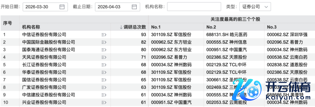 3月30日以来,中信证券调研总次数最多,为93次。从证券公司调研情况看,军信股份等个股受深爱。