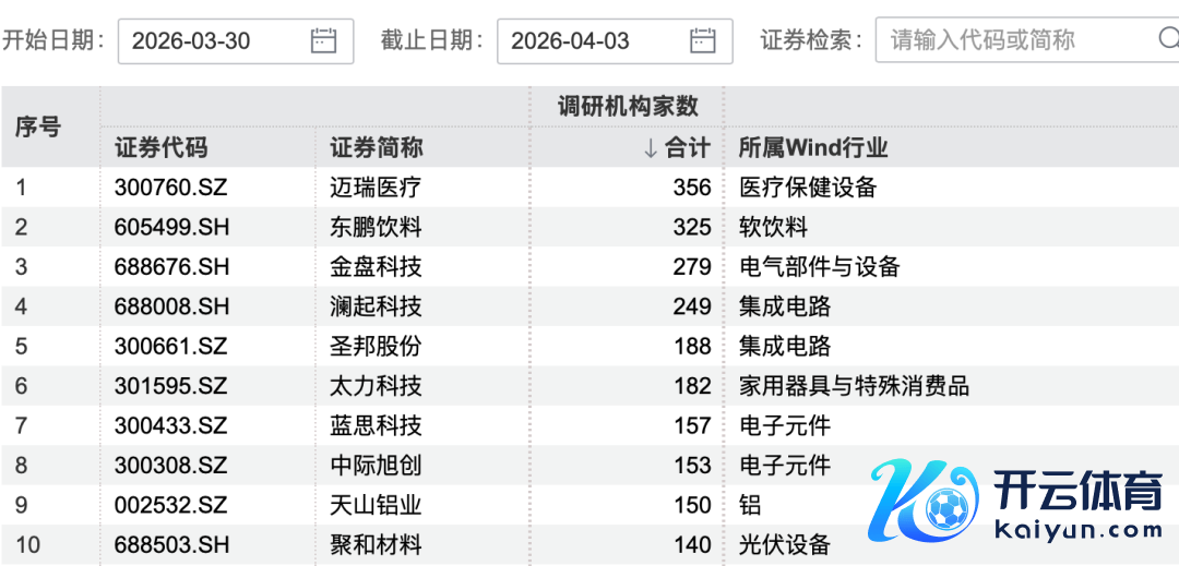 3月30日至4月3日调研总次数排行前十情况图片开端:Wind